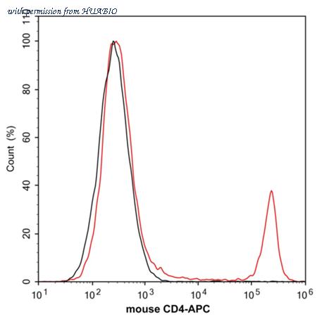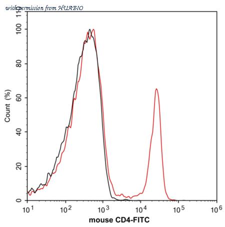 Flow cytometric analysis of BABL/C mouse splenocytes labeling Mouse CD4. Cells were washed twice with cold PBS and resuspend. Then stained with the primary antibody (HA720204F, 1μg/mL) (red). Unlabelled sample was used as a control (cells without incubation with primary antibody; black).