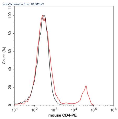 Flow cytometric analysis of BABL/C mouse splenocytes labeling Mouse CD4. Cells were washed twice with cold PBS and resuspend. Then stained with the primary antibody (HA720203F, 1μg/mL) (red). Unlabelled sample was used as a control (cells without incubation with primary antibody; black).
