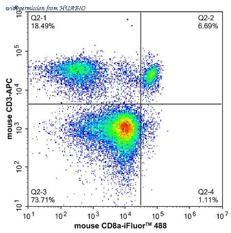 Flow cytometric analysis of mouse spleen cells labeling Mouse CD8 alpha (HA610359) and CD3 (HA720201F, APC). Cells were washed twice with cold PBS and resuspend. Then incubated for 1 hour at +4℃ with primary antibody (HA610359, 1/1,000). After incubation of the primary antibody at +4℃ for an hour, the cells were stained with a iFluor™ 488 conjugate-Goat anti-Rat IgG Secondary antibody (HA1133) at 1/1,000 dilution for 30 minutes at +4℃.