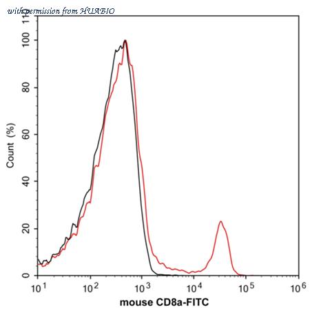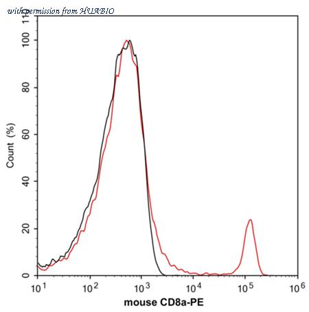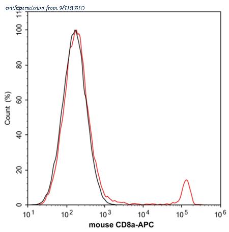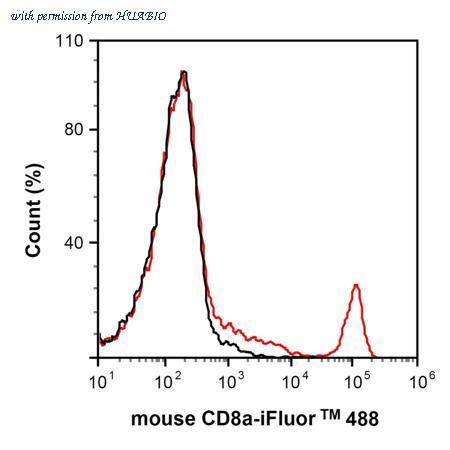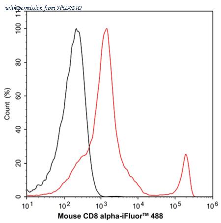 Flow cytometric analysis of mouse peripheral blood cells labeling Mouse CD8 alpha. Cells were washed twice with cold PBS and resuspend. Then stained with the primary antibody (HA610359, 1/2,000) (red). After incubation of the primary antibody at +4℃ for an hour, the cells were stained with a iFluor™ 488 conjugate-Goat anti-Rat IgG Secondary antibody (HA1133) at 1/1,000 dilution for 30 minutes at +4℃. Unlabelled sample was used as a control (cells without incubation with primary antibody; black).