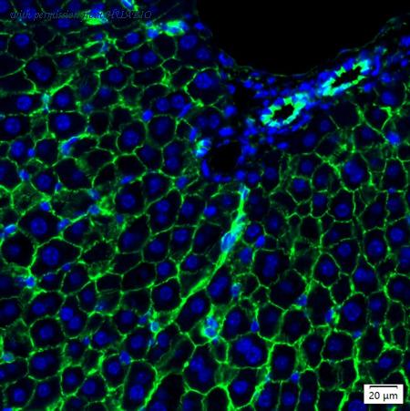 mIHC analysis of mouse liver tissue (Formalin/PFA-fixed paraffin-embedded sections) with Rat anti-Pan-Cadherin antibody (IRS288RT) at 1/100 dilution. The immunostaining was performed with the IRISKitCmTSA Kit (900810). Heat mediated antigen retrieval with Tris-EDTA buffer (pH 9.0) for 30 mins at 95℃. DAPI (blue) was used as a nuclear counter stain. Image acquisition was performed with Olympus VS200 Slide Scanner.