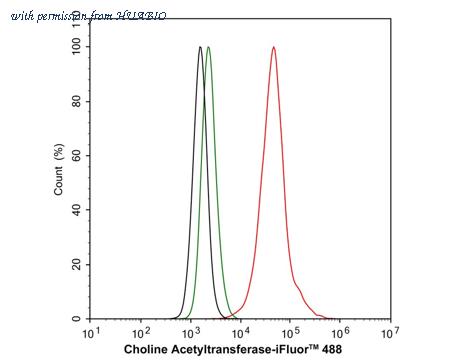 Flow cytometric analysis of HeLa cells labeling Choline Acetyltransferase. Cells were fixed and permeabilized. Then stained with the primary antibody (HA750406, 1μg/mL) (red) compared with Rabbit IgG Isotype Control (green). After incubation of the primary antibody at +4℃ for an hour, the cells were stained with a iFluor™ 488 conjugate-Goat anti-Rabbit IgG Secondary antibody (HA1121) at 1/1,000 dilution for 30 minutes at +4℃. Unlabelled sample was used as a control (cells without incubation with primary antibody; black).