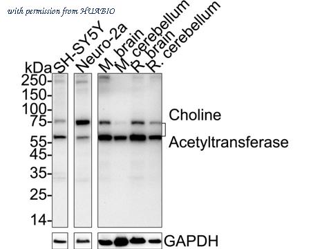 Western blot analysis of Choline Acetyltransferase on different lysates with Rabbit anti-Choline Acetyltransferase antibody (HA723705) at 1/5,000 dilution. Lane 1: SH-SY5Y cell lysate (20 µg/Lane) Lane 2: Neuro-2a cell lysate (negative) (20 µg/Lane) Lane 3: Mouse brain tissue lysate (40 µg/Lane) Lane 4: Mouse cerebellum tissue lysate (40 µg/Lane) Lane 5: Rat brain tissue lysate (40 µg/Lane) Lane 6: Rat cerebellum tissue lysate (40 µg/Lane) Predicted band size: 83 kDa Observed band size: 50/75 kDa Exposure time: 3 minutess; ECL: K1801; 4-20% SDS-PAGE gel. Proteins were transferred to a PVDF membrane and blocked with 5% NFDM/TBST for 1 hour at room temperature. The primary antibody (HA723705) at 1/5,000 dilution was used in primary antibody dilution (K1803) at room temperature for 2 hours. Goat Anti-Rabbit IgG - HRP Secondary Antibody (HA1001) at 1/50,000 dilution was used for 1 hour at room temperature.