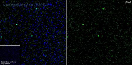 Immunohistochemical analysis of paraffin-embedded mouse brain (caudate nucleus) tissue with Rabbit anti-Choline Acetyltransferase antibody (HA723755) at 1/200 dilution. The section was pre-treated using heat mediated antigen retrieval with Tris-EDTA buffer (pH 9.0) for 20 minutes. The tissues were blocked in 1% BSA for 20 minutes at room temperature, washed with ddH2O and PBS, and then probed with the primary antibody (HA723755) at 1/200 dilution for 1 hour at room temperature. The detection was performed using an HRP conjugated compact polymer system. DAB was used as the chromogen. Tissues were counterstained with hematoxylin and mounted with DPX.