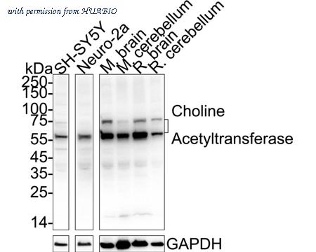Western blot analysis of Choline Acetyltransferase on different lysates with Rabbit anti-Choline Acetyltransferase antibody (HA751543) at 1/5,000 dilution. Lane 1: SH-SY5Y cell lysate (20 µg/Lane) Lane 2: Neuro-2a cell lysate (negative) (20 µg/Lane) Lane 3: Mouse brain tissue lysate (40 µg/Lane) Lane 4: Mouse cerebellum tissue lysate (40 µg/Lane) Lane 5: Rat brain tissue lysate (40 µg/Lane) Lane 6: Rat cerebellum tissue lysate (40 µg/Lane) Predicted band size: 83 kDa Observed band size: 50/75 kDa Exposure time: 3 minutess; ECL: K1801; 4-20% SDS-PAGE gel. Proteins were transferred to a PVDF membrane and blocked with 5% NFDM/TBST for 1 hour at room temperature. The primary antibody (HA751543) at 1/5,000 dilution was used in primary antibody dilution (K1803) at room temperature for 2 hours. Goat Anti-Rabbit IgG - HRP Secondary Antibody (HA1001) at 1/50,000 dilution was used for 1 hour at room temperature.
