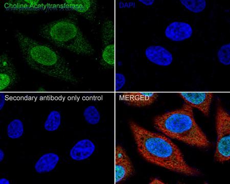 Immunocytochemistry analysis of HeLa cells labeling Choline Acetyltransferase with Rabbit anti-Choline Acetyltransferase antibody (ET1704-16) at 1/100 dilution. Cells were fixed in 4% paraformaldehyde for 20 minutes at room temperature, permeabilized with 0.1% Triton X-100 in PBS for 5 minutes at room temperature, then blocked with 1% BSA in 10% negative goat serum for 1 hour at room temperature. Cells were then incubated with Rabbit anti-Choline Acetyltransferase antibody (ET1704-16) at 1/100 dilution in 1% BSA in PBST overnight at 4 ℃. Goat Anti-Rabbit IgG H&L (iFluor™ 488, HA1121) was used as the secondary antibody at 1/1,000 dilution. PBS instead of the primary antibody was used as the secondary antibody only control. Nuclear DNA was labelled in blue with DAPI. Beta tubulin (M1305-2, red) was stained at 1/100 dilution overnight at +4℃. Goat Anti-Mouse IgG H&L (iFluor™ 594, HA1126) was used as the secondary antibody at 1/1,000 dilution.
