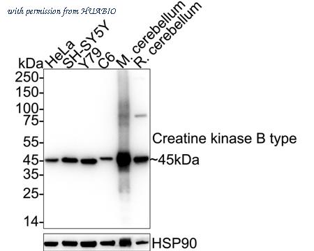Western blot analysis of Creatine kinase B type on different lysates with Rabbit anti-Creatine kinase B type antibody (ET7107-52) at 1/1,000 dilution.