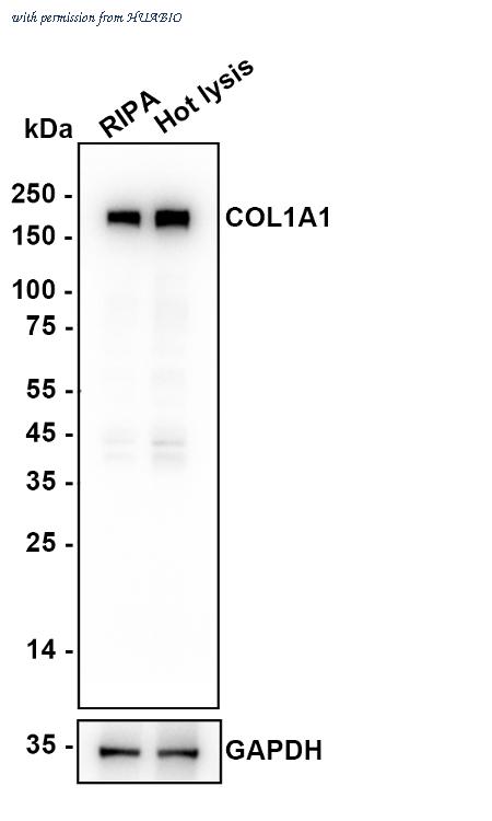 Western blot analysis of COL1A1 on different lysates with Rabbit anti-COL1A1 antibody (HA751058) at 1/2,000 dilution. Lane 1: HFF-1 cell lysate (RIPA buffer) Lane 2: HFF-1 cell lysate (Hot lysis buffer) Predicted band size: 139 kDa Observed band size: 200 kDa Exposure time: 6 seconds; ECL: K1801; 4-20% SDS-PAGE gel. Proteins were transferred to a PVDF membrane and blocked with 5% NFDM/TBST for 1 hour at room temperature. The primary antibody (HA751058) at 1/2,000 dilution was used in K1803 at 4℃ overnight. Goat Anti-Rabbit IgG - HRP Secondary Antibody (HA1001) at 1/50,000 dilution was used for 1 hour at room temperature.