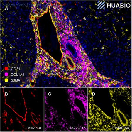 Fluorescence multiplex immunohistochemical analysis of human liver (Formalin/PFA-fixed paraffin-embedded sections). Panel A: the merged image of anti-CD31(M1511-8, Red), anti-COL1A1(HA722517, Magenta) and anti-αSMA (ET1607-53, Yellow) on human liver. HRP Conjugated UltraPolymer Goat Polyclonal Antibody HA1119/HA1120 was used as a secondary antibody. The immunostaining was performed with the Sequential Immuno-staining Kit (IRISKit™MH010101, www.luminiris.cn). The section was incubated in three rounds of staining: in the order of M1511-8 (1/1000 dilution), HA722517 (1/10000 dilution) and ET1607-53 (1/5000 dilution) for 20 mins at room temperature. Each round was followed by a separate fluorescent tyramide signal amplification system. Heat mediated antigen retrieval with Tris-EDTA buffer (pH 9.0) for 30 mins at 95C. DAPI (blue) was used as a nuclear counter stain. Image acquisition was performed with Olympus VS200 Slide Scanner.