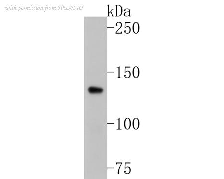 Western blot analysis of COL1A1 on different lysates with Rabbit anti-COL1A1 antibody (HA751058) at 1/1,000 dilution. Lane 1: HFF-1 cell lysate (20 µg/Lane) Lane 2: NIH/3T3 cell lysate (20 µg/Lane) Lane 3: Human lung tissue lysate (40 µg/Lane) Lane 4: Mouse skin tissue lysate (40 µg/Lane) Lane 5: Rat skin tissue lysate (40 µg/Lane) Predicted band size: 139 kDa Observed band size: 200/139 kDa Exposure time: Lane 1-4: 1 minute; Lane 5: 3 seconds; ECL: K1801; 4-20% SDS-PAGE gel. Proteins were transferred to a PVDF membrane and blocked with 5% NFDM/TBST for 1 hour at room temperature. The primary antibody (HA751058) at 1/1,000 dilution was used in 5% NFDM/TBST at 4℃ overnight. Goat Anti-Rabbit IgG - HRP Secondary Antibody (HA1001) at 1/50,000 dilution was used for 1 hour at room temperature.