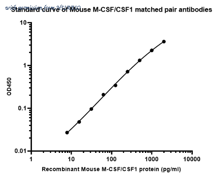 Sandwich ELISA analysis of Mouse M-CSF/CSF1 matched pair antibodies Capture: HA723792, Mouse M-CSF/CSF1 Rabbit mAb [PSH15-84] Detector: HA723793, Mouse M-CSF/CSF1 Rabbit mAb [PSH15-85] Elisa assay was performed by coating wells of a 96-well plate with 100 µl per well of capture antibody (HA723792) diluted in carbonate/bicarbonate buffer, at a concentration of 2 µg/ml overnight at 4℃. Wells of the plate were washed, blocked with 150 µl 0.05% tween-20 1% BSA blocking buffer, and incubated with serial diluted Recombinant Mouse M-CSF/CSF1 protein (HA211182) starting from 2,000 pg/ml to 0 pg/ml and detect antibody (HA723793, Biotin, 0.2 µg/ml) for 1 hour at 30℃ with shaking. Then the plate was washed and incubated with 100 µl per well of SA-HRP for 0.5 hour at 30℃ with shaking. Detection was performed using an Ultra TMB Substrate for 10 minutes at room temperature in the dark. The reaction was stopped with sulfuric acid and absorbances were read on a spectrophotometer at 450 nm.