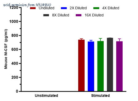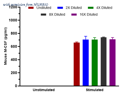 Interpolated concentrations of native M-CSF in mouse LPS and recombinant mouse ING-γ unstimulated and stimulated RAW264.7 cell culture supernatant. Capture: HA723792, Mouse M-CSF/CSF1 Rabbit mAb [PSH15-84] Detector: HA723793, Mouse M-CSF/CSF1 Rabbit mAb [PSH15-85] RAW264.7 cells were stimulated with 1 µg/ml LPS and 30 ng/ml recombinant mouse ING-γ or vehicle control and incubated for 24 hours. The concentrations of M-CSF measured in duplicate and interpolated from the M-CSF standard curve and corrected for sample dilution. Undiluted samples are as follows: unstimulated 100% and stimulated 100%. The interpolated dilution factor corrected values are plotted (mean +/- SD, n=2). The mean M-CSF concentration was determined to be 731.4 pg/ml in LPS and recombinant mouse ING-γ stimulated RAW264.7 cell culture supernatant and undetectable in the unstimulated RAW264.7 control.