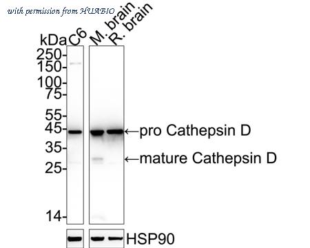 Western blot analysis of Cathepsin D on different lysates with Rabbit anti-Cathepsin D antibody (HA750152) at 1/1,000 dilution. Lane 1: C6 cell lysate (20 µg/Lane) Lane 2: Mouse brain tissue lysate (20 µg/Lane) Lane 3: Rat brain tissue lysate (20 µg/Lane) Predicted band size: 45/28 kDa Observed band size: 45/28 kDa Exposure time: 6 seconds; ECL: K1801; 4-20% SDS-PAGE gel. Proteins were transferred to a PVDF membrane and blocked with 5% NFDM/TBST for 1 hour at room temperature. The primary antibody (HA750152) at 1/1,000 dilution was used in 5% NFDM/TBST at 4℃ overnight. Goat Anti-Rabbit IgG - HRP Secondary Antibody (HA1001) at 1/50,000 dilution was used for 1 hour at room temperature.