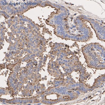 Immunohistochemical analysis of paraffin-embedded human breast cancer tissue with Rabbit anti-Cathepsin D antibody (ET1608-49) at 1/3,000 dilution. The section was pre-treated using heat mediated antigen retrieval with Tris-EDTA buffer (pH 9.0) for 20 minutes. The tissues were blocked in 1% BSA for 20 minutes at room temperature, washed with ddH2O and PBS, and then probed with the primary antibody (ET1608-49) at 1/3,000 dilution for 1 hour at room temperature. The detection was performed using an HRP conjugated compact polymer system. DAB was used as the chromogen. Tissues were counterstained with hematoxylin and mounted with DPX.