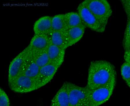 ICC staining Cathepsin D in Hela cells (green). The nuclear counter stain is DAPI (blue). Cells were fixed in paraformaldehyde, permeabilised with 0.25% Triton X100/PBS.