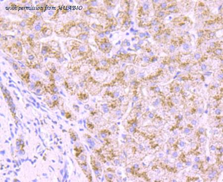 Immunohistochemical analysis of paraffin-embedded human liver tissue using anti-Cathepsin D antibody. Counter stained with hematoxylin.