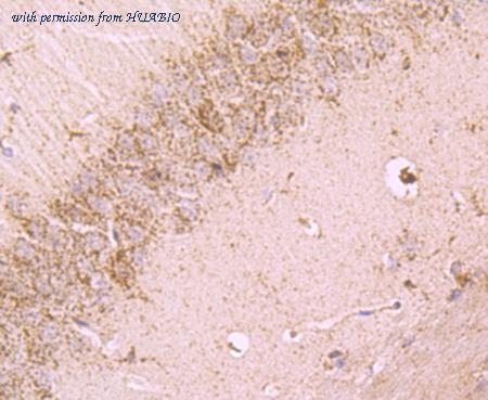 Immunohistochemical analysis of paraffin-embedded mouse brain tissue using anti-Cathepsin D antibody. Counter stained with hematoxylin.