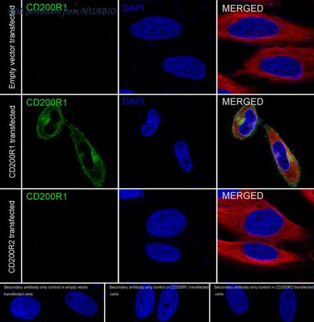 Immunocytochemistry analysis of HeLa cells labeling Human CD200R1 with Rabbit anti-Human CD200R1 antibody (HA722211) at 1/100 dilution. HeLa cells, transfected with empty control, CD200R1 or CD200R2 expression vector, respectively, were fixed in 4% paraformaldehyde for 10 minutes at room temperature, permeabilized with 0.1% Triton X-100 in PBS for 15 minutes at room temperature, then blocked with 1% BSA in 10% negative goat serum for 1 hour at room temperature. Cells were then incubated with Rabbit anti-Human CD200R1 antibody (HA722211) at 1/100 dilution in 1% BSA in PBST overnight at 4 ℃. Goat Anti-Rabbit IgG H&L (iFluor™ 488, HA1121) was used as the secondary antibody at 1/1,000 dilution. PBS instead of the primary antibody was used as the secondary antibody only control. Nuclear DNA was labelled in blue with DAPI. Beta tubulin (M1305-2, red) was stained at 1/100 dilution overnight at +4℃. Goat Anti-Mouse IgG H&L (iFluor™ 594, HA1126) was used as the secondary antibody at 1/1,000 dilution.