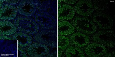 Immunofluorescence analysis of frozen mouse testis tissue with Rabbit anti-DDX4 antibody (HA751228) at 1/500 dilution. The section was pre-treated using heat mediated antigen retrieval with sodium citrate buffer (pH 6.0) for about 2 minutes in microwave oven. The tissues were blocked in 10% negative goat serum for 1 hour at room temperature, washed with PBS, and then probed with the primary antibody (HA751228, green) at 1/500 dilution overnight at 4 ℃, washed with PBS. Goat Anti-Rabbit IgG H&L (iFluor™ 488, HA1121) was used as the secondary antibody at 1/1,000 dilution. Nuclei were counterstained with DAPI (blue).