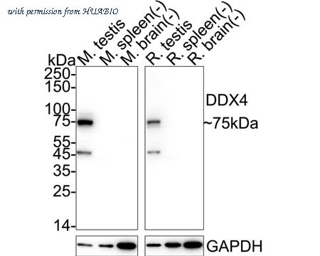 Western blot analysis of DDX4 on different lysates with Rabbit anti-DDX4 antibody (HA751229) at 1/2,000 dilution. Lane 1: Mouse testis tissue lysate Lane 2: Mouse spleen tissue lysate (negative) Lane 3: Mouse brain tissue lysate (negative) Lane 4: Rat testis tissue lysate Lane 5: Rat spleen tissue lysate (negative) Lane 6: Rat brain tissue lysate (negative) Lysates/proteins at 20 µg/Lane. Predicted band size: 79 kDa Observed band size: 75 kDa Exposure time: 4 seconds; ECL: K1801; 4-20% SDS-PAGE gel. Proteins were transferred to a PVDF membrane and blocked with 5% NFDM/TBST for 1 hour at room temperature. The primary antibody (HA751229) at 1/2,000 dilution was used in 5% NFDM/TBST at 4℃ overnight. Goat Anti-Rabbit IgG - HRP Secondary Antibody (HA1001) at 1/50,000 dilution was used for 1 hour at room temperature.