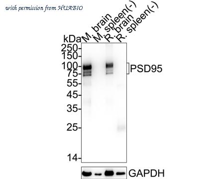 Western blot analysis of PSD95 on different lysates with Rat anti-PSD95 antibody (HA601416) at 1/5,000 dilution. Lane 1: Mouse brain tissue lysate Lane 2: Mouse spleen tissue lysate (negative) Lane 3: Rat brain tissue lysate Lane 4: Rat spleen tissue lysate (negative) Lysates/proteins at 20 µg/Lane. Predicted band size: 80 kDa Observed band size: 75-100 kDa Exposure time: 2 seconds; ECL: K1801; 4-20% SDS-PAGE gel. Proteins were transferred to a PVDF membrane and blocked with 5% NFDM/TBST for 1 hour at room temperature. The primary antibody (HA601416) at 1/5,000 dilution was used in primary antibody dilution (K1803) at 4℃ overnight. Goat Anti-Rat IgG H&L - HRP Secondary Antibody (HA1023) at 1/5,000 dilution was used for 1 hour at room temperature.