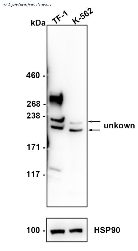 Western blot analysis of CD35 on different lysates with Rabbit anti-CD35 antibody (ER2001-14) at 1/1,000 dilution. Lane 1: TF-1 cell lysate Lane 2: K-562 cell lysate (negative) Lysates/proteins at 20 µg/Lane. Predicted band size: 224 kDa Observed band size: 280 kDa Exposure time: 1 minute; ECL: K1801; 3-8% SDS-PAGE gel. Proteins were transferred to a PVDF membrane and blocked with 5% NFDM/TBST for 1 hour at room temperature. The primary antibody (ER2001-14) at 1/1,000 dilution was used in 5% NFDM/TBST at 4℃ overnight. Goat Anti-Rabbit IgG - HRP Secondary Antibody (HA1001) at 1/50,000 dilution was used for 1 hour at room temperature.