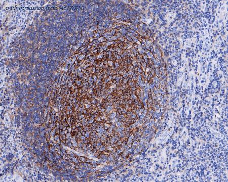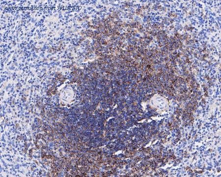 Immunohistochemical analysis of paraffin-embedded human spleen tissue with Mouse anti-CD35 antibody (HA601023) at 1/1,500 dilution. The section was pre-treated using heat mediated antigen retrieval with Tris-EDTA buffer (pH 9.0) for 20 minutes. The tissues were blocked in 1% BSA for 20 minutes at room temperature, washed with ddH2O and PBS, and then probed with the primary antibody (HA601023) at 1/1,500 dilution for 1 hour at room temperature. The detection was performed using an HRP conjugated compact polymer system. DAB was used as the chromogen. Tissues were counterstained with hematoxylin and mounted with DPX.