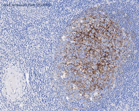 Immunohistochemical analysis of paraffin-embedded human hodgkin lymphoma tissue with Mouse anti-CD35 antibody (HA601023) at 1/2,000 dilution. The section was pre-treated using heat mediated antigen retrieval with Tris-EDTA buffer (pH 9.0) for 20 minutes. The tissues were blocked in 1% BSA for 20 minutes at room temperature, washed with ddH2O and PBS, and then probed with the primary antibody (HA601023) at 1/2,000 dilution for 1 hour at room temperature. The detection was performed using an HRP conjugated compact polymer system. DAB was used as the chromogen. Tissues were counterstained with hematoxylin and mounted with DPX.
