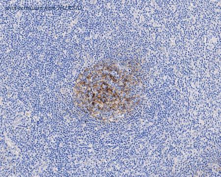 Immunohistochemical analysis of paraffin-embedded human Hodgkin lymphoma tissue with Mouse anti-CD35 antibody (HA601217) at 1/1,000 dilution. The section was pre-treated using heat mediated antigen retrieval with Tris-EDTA buffer (pH 9.0) for 20 minutes. The tissues were blocked in 1% BSA for 20 minutes at room temperature, washed with ddH2O and PBS, and then probed with the primary antibody (HA601217) at 1/1,000 dilution for 1 hour at room temperature. The detection was performed using an HRP conjugated compact polymer system. DAB was used as the chromogen. Tissues were counterstained with hematoxylin and mounted with DPX.