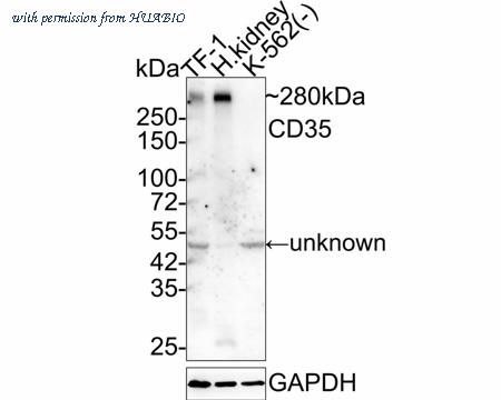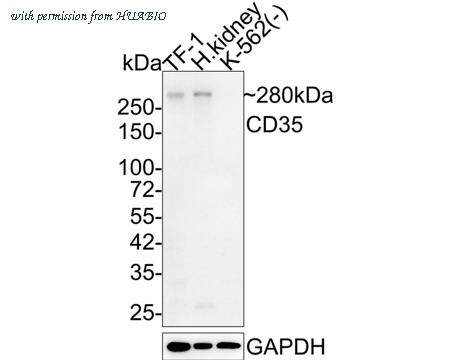 Western blot analysis of CD35 on different lysates with Mouse anti-CD35 antibody (HA601022) at 1/2,000 dilution. Lane 1: TF-1 cell lysate Lane 2: Human kidney tissue lysate Lane 3: K-562 cell lysate (negative) Lysates/proteins at 20 µg/Lane. Predicted band size: 224 kDa Observed band size: 280 kDa Exposure time: 1 minute 14 seconds; ECL: K1802; 4-20% SDS-PAGE gel. Proteins were transferred to a PVDF membrane and blocked with 5% NFDM/TBST for 1 hour at room temperature. The primary antibody (HA601022) at 1/2,000 dilution was used in 5% NFDM/TBST at 4℃ overnight. Goat Anti-Mouse IgG - HRP Secondary Antibody (HA1006) at 1/50,000 dilution was used for 1 hour at room temperature.