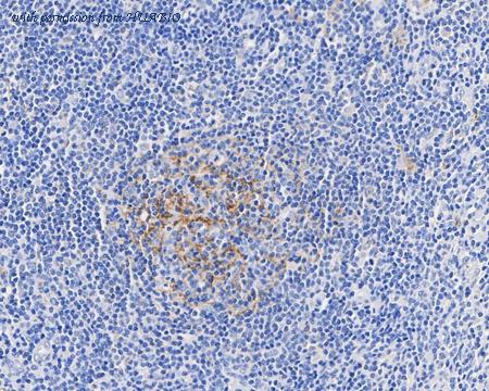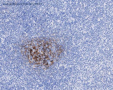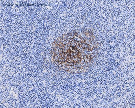 Immunohistochemical analysis of paraffin-embedded human tonsil tissue with Mouse anti-CD35 antibody (HA601022) at 1/1,000 dilution. The section was pre-treated using heat mediated antigen retrieval with Tris-EDTA buffer (pH 9.0) for 20 minutes. The tissues were blocked in 1% BSA for 20 minutes at room temperature, washed with ddH2O and PBS, and then probed with the primary antibody (HA601022) at 1/1,000 dilution for 1 hour at room temperature. The detection was performed using an HRP conjugated compact polymer system. DAB was used as the chromogen. Tissues were counterstained with hematoxylin and mounted with DPX.