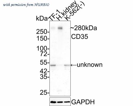 Western blot analysis of CD35 on different lysates with Mouse anti-CD35 antibody (HA601250) at 1/2,000 dilution. Lane 1: TF-1 cell lysate Lane 2: Human kidney tissue lysate Lane 3: K-562 cell lysate (negative) Lysates/proteins at 20 µg/Lane. Predicted band size: 224 kDa Observed band size: 280 kDa Exposure time: 3 minutes; ECL: K1802; 4-20% SDS-PAGE gel. Proteins were transferred to a PVDF membrane and blocked with 5% NFDM/TBST for 1 hour at room temperature. The primary antibody (HA601250) at 1/2,000 dilution was used in 5% NFDM/TBST at 4℃ overnight. Goat Anti-Mouse IgG - HRP Secondary Antibody (HA1006) at 1/50,000 dilution was used for 1 hour at room temperature.
