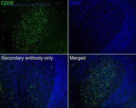 Immunohistochemical analysis of paraffin-embedded human tonsil tissue with Rabbit anti-CD35 antibody (ET7111-05) at 1/50 dilution. The section was pre-treated using heat mediated antigen retrieval with Tris-EDTA buffer (pH 6.0)) for 20 minutes. The tissues were blocked in 1% BSA for 20 minutes at room temperature, washed with ddH2O and PBS, and then probed with the primary antibody (ET7111-05) at 1/50 dilution for 0.5 hour at room temperature. The detection was performed using an HRP conjugated compact polymer system. DAB was used as the chromogen. Tissues were counterstained with hematoxylin and mounted with DPX.
