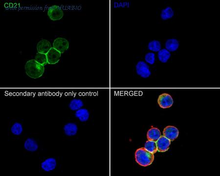 ICC staining CD21 in LOVO cells (green). The nuclear counter stain is DAPI (blue). Cells were fixed in paraformaldehyde, permeabilised with 0.25% Triton X100/PBS.