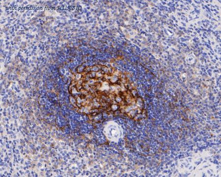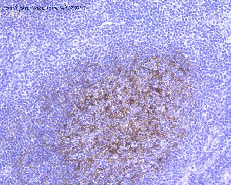 Immunohistochemical analysis of paraffin-embedded human tonsil tissue using anti-CD21 antibody. Counter stained with hematoxylin.