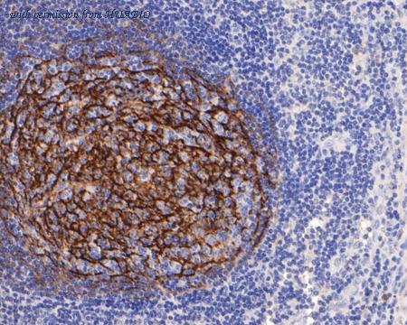 Immunohistochemical analysis of paraffin-embedded human tonsil tissue using anti-CD21 antibody. The section was pre-treated using heat mediated antigen retrieval with Tris-EDTA buffer (pH 8.0-8.4) for 20 minutes.The tissues were blocked in 5% BSA for 30 minutes at room temperature, washed with ddH2O and PBS, and then probed with the primary antibody (HA600001, 1/400) for 30 minutes at room temperature. The detection was performed using an HRP conjugated compact polymer system. DAB was used as the chromogen. Tissues were counterstained with hematoxylin and mounted with DPX.