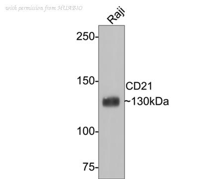 Western blot analysis of CD21 on Raji cell lysates with Rabbit anti-CD21 antibody (HA721163) at 1/1,000 dilution. Lysates/proteins at 10 µg/Lane. Predicted band size: 113 kDa Observed band size: 130 kDa Exposure time: 2 minutes; 6% SDS-PAGE gel. Proteins were transferred to a PVDF membrane and blocked with 5% NFDM/TBST for 1 hour at room temperature. The primary antibody (HA721163) at 1/1,000 dilution was used in 5% NFDM/TBST at room temperature for 2 hours. Goat Anti-Rabbit IgG - HRP Secondary Antibody (HA1001) at 1:300,000 dilution was used for 1 hour at room temperature.