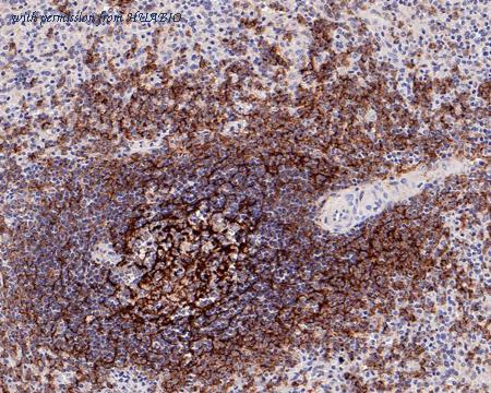 Immunohistochemical analysis of paraffin-embedded human spleen tissue with Rabbit anti-CD21 antibody (HA721163) at 1/4,000 dilution. The section was pre-treated using heat mediated antigen retrieval with Tris-EDTA buffer (pH 9.0) for 20 minutes. The tissues were blocked in 1% BSA for 20 minutes at room temperature, washed with ddH2O and PBS, and then probed with the primary antibody (HA721163) at 1/4,000 dilution for 1 hour at room temperature. The detection was performed using an HRP conjugated compact polymer system. DAB was used as the chromogen. Tissues were counterstained with hematoxylin and mounted with DPX.