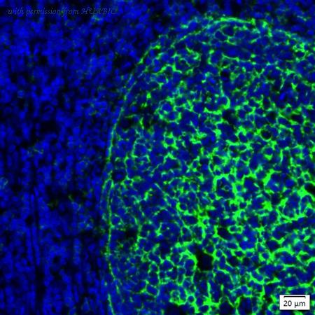 mIHC analysis of human tonsils tissue (Formalin/PFA-fixed paraffin-embedded sections) with Rat anti-CD21 antibody (IRS265RT) at 1/100 dilution. The immunostaining was performed with the IRISKitCmTSA Kit (900810). Heat mediated antigen retrieval with Tris-EDTA buffer (pH 9.0) for 30 mins at 95℃. DAPI (blue) was used as a nuclear counter stain. Image acquisition was performed with Olympus VS200 Slide Scanner.