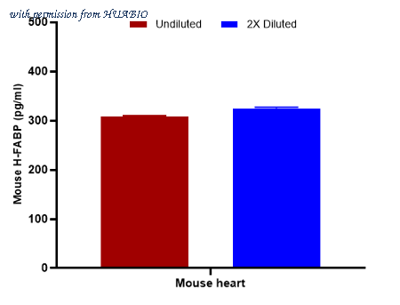Interpolated concentrations of native H-FABP in mouse heart extract samples based on a 1,000 μg/ml extract load. Capture: HA725177, Human H-FABP Rabbit mAb [PSH16-98] Detector: HA725178, Human H-FABP Rabbit mAb [PSH16-99] The concentrations of H-FABP were measured in duplicates, interpolated from the H-FABP standard curve and corrected for sample dilution. Undiluted samples are mouse heart extract 50%. The interpolated dilution factor corrected values are plotted (mean +/- SD, n=2). The mean H-FABP concentration was determined to be 316 pg/ml in mouse heart extract.