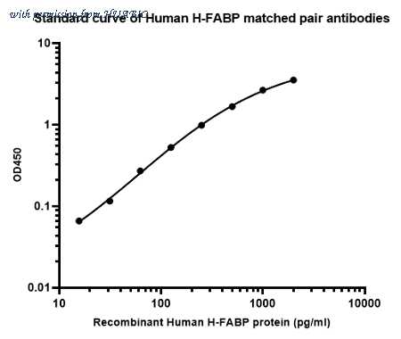 Sandwich ELISA analysis of Human H-FABP matched pair antibodies Capture: HA725177, Human H-FABP Rabbit mAb [PSH16-98] Detector: HA725178, Human H-FABP Rabbit mAb [PSH16-99] Elisa assay was performed by coating wells of a 96-well plate with 50 µl per well of capture antibody (HA725177) diluted in carbonate/bicarbonate buffer, at a concentration of 2 µg/ml overnight at 4℃. Wells of the plate were washed, blocked with 150 µl 0.05% tween-20 1% BSA blocking buffer, and incubated with serial diluted Recombinant Human H-FABP protein (HA211159) starting from 2,000 pg/ml to 0 pg/ml and detect antibody (HA725178, Biotin, 0.2 µg/ml) for 1 hour at 30℃ with shaking. Then the plate was washed and incubated with 50 µl per well of SA-HRP for 0.5 hour at 30℃ with shaking. Detection was performed using an Ultra TMB Substrate for 10 minutes at room temperature in the dark. The reaction was stopped with sulfuric acid and absorbances were read on a spectrophotometer at 450 nm.