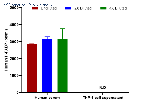 Interpolated concentrations of native H-FABP in human serum and THP-1 cell supernatant. Capture: HA725177, Human H-FABP Rabbit mAb [PSH16-98] Detector: HA725178, Human H-FABP Rabbit mAb [PSH16-99] The concentrations of H-FABP were measured in duplicates, interpolated from the H-FABP standard curve and corrected for sample dilution. Undiluted samples are human serum 50% and THP-1 cell culture supernatant 100%. The interpolated dilution factor corrected values are plotted (mean +/- SD, n=2). The mean H-FABP concentration was determined to be 2,876 pg/ml in human serum and undetectable in THP-1 cell culture supernatant.