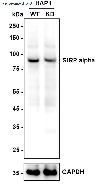 Western blot analysis of SIRP alpha on different lysates with Rabbit anti-SIRP alpha antibody (HA721316) at 1/1,000 dilution. Lane 1: HAP1-parental cell lysate Lane 2: HAP1-SIRP alpha KD cell lysate Lysates/proteins at 10 µg/Lane. Predicted band size: 55 kDa Observed band size: 75-100 kDa Exposure time: 9 seconds; ECL: K1801; 4-20% SDS-PAGE gel. Proteins were transferred to a PVDF membrane and blocked with 5% NFDM/TBST for 1 hour at room temperature. The primary antibody (HA721316) at 1/1,000 dilution was used in K1803 at 4℃ overnight. Goat Anti-Rabbit IgG - HRP Secondary Antibody (HA1001) at 1/50,000 dilution was used for 1 hour at room temperature.