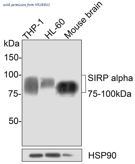 Western blot analysis of SIRP alpha on different lysates with Rabbit anti-SIRP alpha antibody (HA721316) at 1/1,000 dilution. Lane 1: THP-1 cell lysate (10 µg/Lane) Lane 2: HL-60 cell lysate (10 µg/Lane) Lane 3: Mouse brain tissue lysate (20 µg/Lane) Predicted band size: 55 kDa Observed band size: 75-100 kDa Exposure time: 2 minutes; 8% SDS-PAGE gel. Proteins were transferred to a PVDF membrane and blocked with 5% NFDM/TBST for 1 hour at room temperature. The primary antibody (HA721316) at 1/1,000 dilution was used in 5% NFDM/TBST at room temperature for 2 hours. Goat Anti-Rabbit IgG - HRP Secondary Antibody (HA1001) at 1:300,000 dilution was used for 1 hour at room temperature.