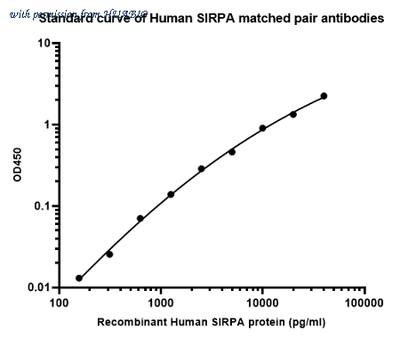 Sandwich ELISA analysis of Human SIRP alpha matched pair antibodies Capture: HA725347, Human SIRP alpha Rabbit mAb [PSH17-63] Detector: HA725348, Human SIRP alpha Rabbit mAb [PSH17-64] Elisa assay was performed by coating wells of a 96-well plate with 50 µl per well of capture antibody (HA725347) diluted in carbonate/bicarbonate buffer, at a concentration of 2 µg/ml overnight at 4℃. Wells of the plate were washed, blocked with 150 µl 0.05% tween-20 1% BSA blocking buffer, and incubated with serial diluted Recombinant human SIRP alpha (HA211204) protein starting from 40,000 pg/ml to 0 pg/ml and detect antibody (HA725348, Biotin, 0.2 µg/ml) for 1 hour at 30℃ with shaking. Then the plate was washed and incubated with 50 µl per well of SA-HRP for 0.5 hour at 30℃ with shaking. Detection was performed using an Ultra TMB Substrate for 10 minutes at room temperature in the dark. The reaction was stopped with sulfuric acid and absorbances were read on a spectrophotometer at 450 nm.