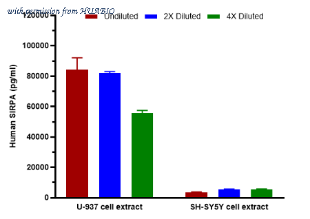Interpolated concentrations of native SIRPA in U-937 cell extract and SH-SY5Y cell extract: Capture: HA725347, Human SIRP alpha Rabbit mAb [PSH17-63] Detector: HA725348, Human SIRP alpha Rabbit mAb [PSH17-64] The concentrations of SIRPA were measured in duplicates, interpolated from the SIRPA standard curve and corrected for sample dilution. Undiluted samples are U-937 cell extract 400 µg/mL and SH-SY5Y cell extract 400 µg/mL. The interpolated dilution factor corrected values are plotted (mean +/- SD, n=2). The mean SIRPA concentration was determined to be 73,992 pg/ml in U-937 cell culture supernatant and 4,844 pg/ml in SH-SY5Y cell extract.