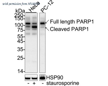 Western blot analysis of PARP1 on different lysates with Rabbit anti-PARP1 antibody (HA750154) at 1/2,000 dilution. Lane 1: HeLa whole cell lysate Lane 2: HeLa treated with 1μM staurosporine for 3 hours whole cell lysate Lysates/proteins at 20 µg/Lane. Predicted band size: 113 kDa Observed band size: 113/28 kDa Exposure time: 1 minute 9 seconds; ECL: K1801; 4-20% SDS-PAGE gel. Proteins were transferred to a PVDF membrane and blocked with 5% NFDM/TBST for 1 hour at room temperature. The primary antibody (HA750154) at 1/2,000 dilution was used in 5% NFDM/TBST at 4℃ overnight. Goat Anti-Rabbit IgG - HRP Secondary Antibody (HA1001) at 1:50,000 dilution was used for 1 hour at room temperature.
