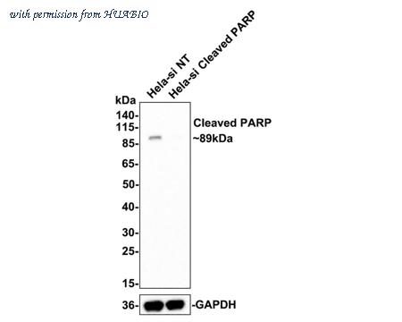 Western blot analysis of Cleaved PARP on different lysates with Rabbit anti-Cleaved PARP antibody (HA750136) at 1/500 dilution. Lane 1: Hela-si NT cell lysate (10 µg/Lane) Lane 2: Hela-si Cleaved PARP cell lysate (10 µg/Lane) Predicted band size: 89 kDa Observed band size: 89 kDa Exposure time: 3 minutes; 4-20% SDS-PAGE gel. ET1608-10 was shown to specifically react with Cleaved PARP in Hela-si NT cells. No band was observed when Hela-si Cleaved PARP sample was tested. Hela-si NT and Hela-si Cleaved PARP samples were subjected to SDS-PAGE. Proteins were transferred to a PVDF membrane and blocked with 5% NFDM in TBST for 1 hour at room temperature. The primary antibody (ET1608-10, 1/500) and Loading control antibody (Rabbit anti-GAPDH, ET1601-4, 1/10,000) were used in 5% BSA at room temperature for 2 hours. Goat Anti-rabbit IgG-HRP Secondary Antibody (HA1001) at 1:300,000 dilution was used for 1 hour at room temperature.