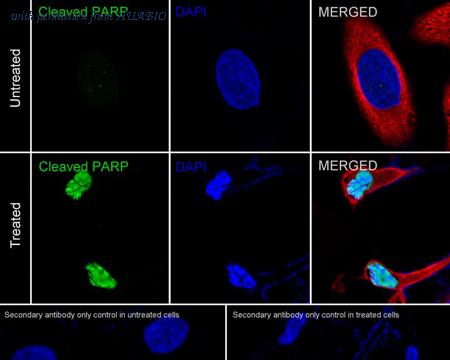 Immunocytochemistry analysis of HeLa cells treated with 1μM staurosporine for 180 minutes labeling Cleaved PARP with Rabbit anti-Cleaved PARP antibody (HA750136) at 1/250 dilution. Cells were fixed in 4% paraformaldehyde for 20 minutes at room temperature, permeabilized with 0.1% Triton X-100 in PBS for 5 minutes at room temperature, then blocked with 1% BSA in 10% negative goat serum for 1 hour at room temperature. Cells were then incubated with Rabbit anti-Cleaved PARP antibody (HA750136) at 1/250 dilution in 1% BSA in PBST overnight at 4 ℃. Goat Anti-Rabbit IgG H&L (iFluor™ 488, HA1121) was used as the secondary antibody at 1/1,000 dilution. PBS instead of the primary antibody was used as the secondary antibody only control. Nuclear DNA was labelled in blue with DAPI. Beta tubulin (M1305-2, red) was stained at 1/100 dilution overnight at +4℃. Goat Anti-Mouse IgG H&L (iFluor™ 594, HA1126) was used as the secondary antibody at 1/1,000 dilution.