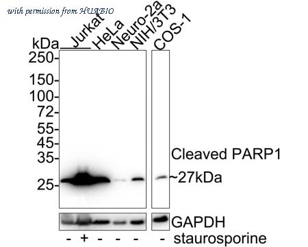 Western blot analysis of Cleaved PARP1 on different lysates with Rabbit anti-Cleaved PARP1 antibody (HA722218) at 1/2,000 dilution. Lane 1: Jurkat cell lysate Lane 2: Jurkat treated with 1μM staurosporine for 3 hours cell lysate Lane 3: HeLa cell lysate Lane 4: Neuro-2a cell lysate Lane 5: NIH/3T3 cell lysate Lane 6: COS-1 cell lysate Lysates/proteins at 20 µg/Lane. Predicted band size: 27 kDa Observed band size: 27 kDa Exposure time: 25 seconds; ECL: K1801; 4-20% SDS-PAGE gel. Proteins were transferred to a PVDF membrane and blocked with 5% NFDM/TBST for 1 hour at room temperature. The primary antibody (HA722218) at 1/2,000 dilution was used in 5% NFDM/TBST at 4℃ overnight. Goat Anti-Rabbit IgG - HRP Secondary Antibody (HA1001) at 1/50,000 dilution was used for 1 hour at room temperature.